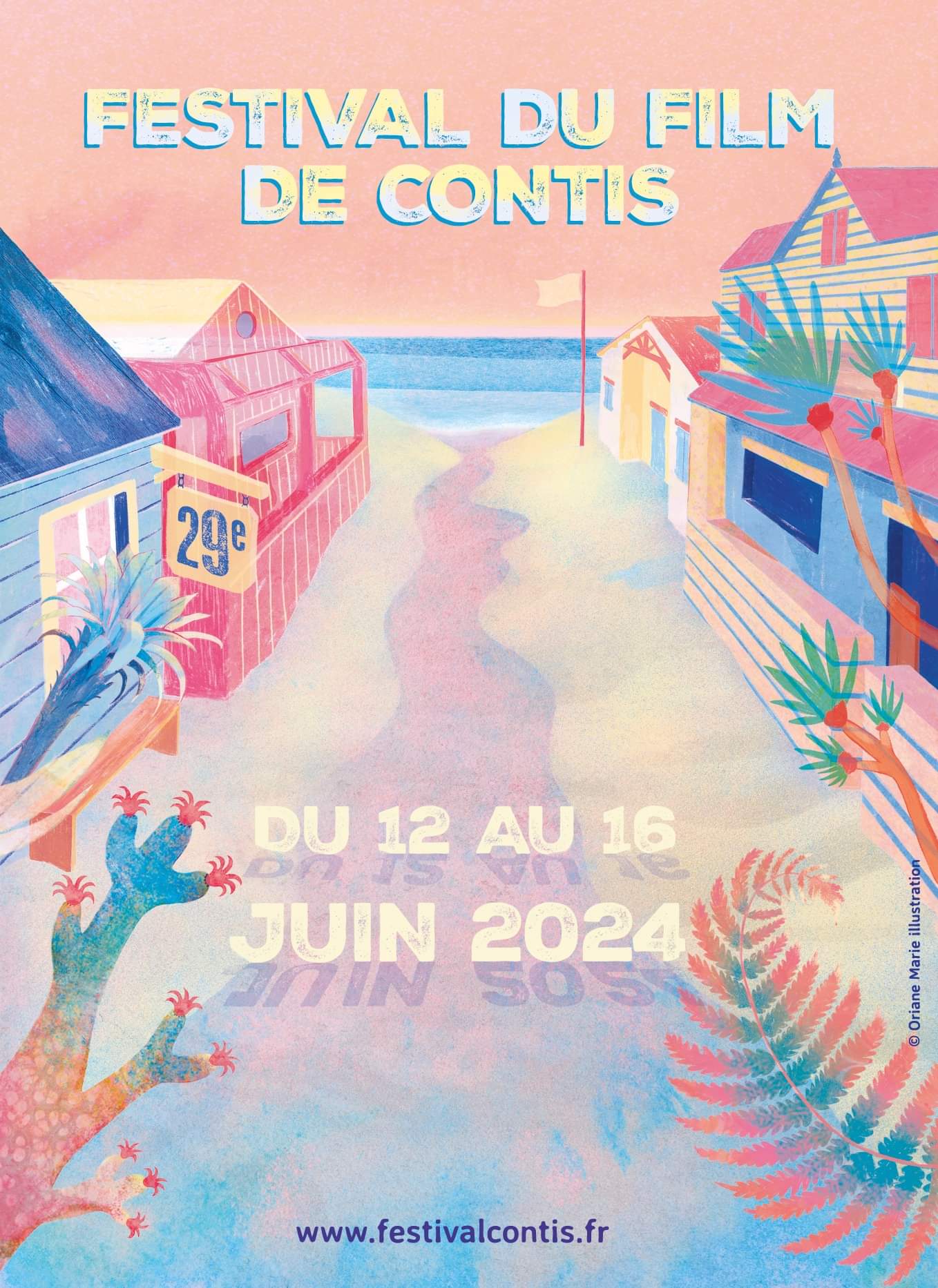 Nous sommes très heureux de vous présenter la nouvelle affiche du Festival du film de Contis réalisée par la talentueuse Oriane Marie. Cette création représente bien plus qu'une simple illustration : elle incarne avec douceur l'esprit singulier et créatif qui lie la station balnéaire de Contis et le Festival.